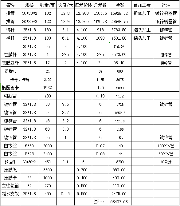 下邊為大家列出的清單為9米x50米和10米x60米兩種大棚,每種2個,一共4個大棚,一共2100平方,造價:68400元: